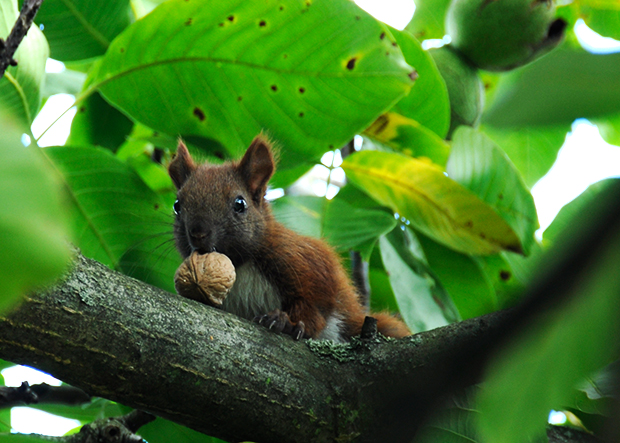 Eichhörnchen Sciurus vulgaris, beim Nüsse klauen erwischt