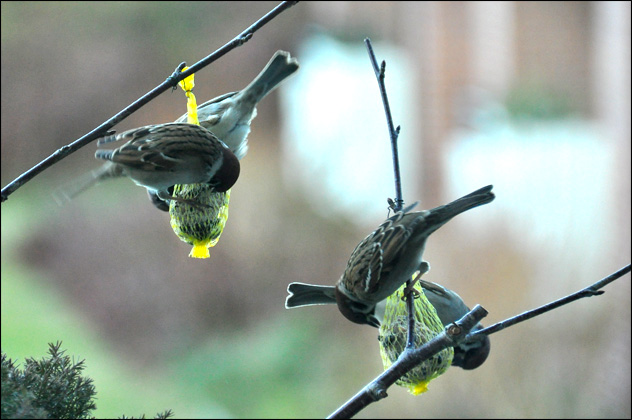 Haussperling, Passer domesticus, am Futterplatz