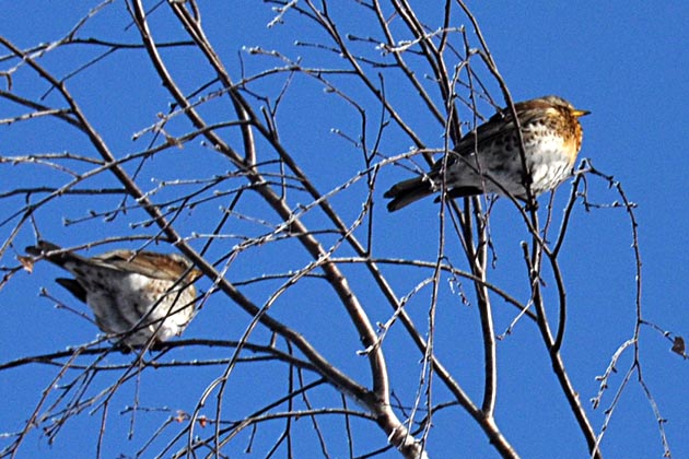 Ein Schwarm von ca. 30 Tieren, vermutlich Wacholderdrosseln Turdus philomelos.