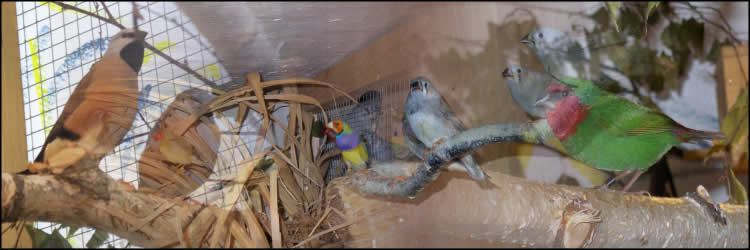 | Der Tierbestand: Binsenastrild, Cremastrild, Gouldamadine, Grauedelsänger, Gürtelgrasfink, Kanarienvögel ,Kubafink, Maskenamadine, Mosambikgirlitz, Reisfinken, Ringelamadine, Rotköpfige Papageiamadine, Tiegerfink, Timor-Zebrafink, Zebrafinken, Zeresamadine. |